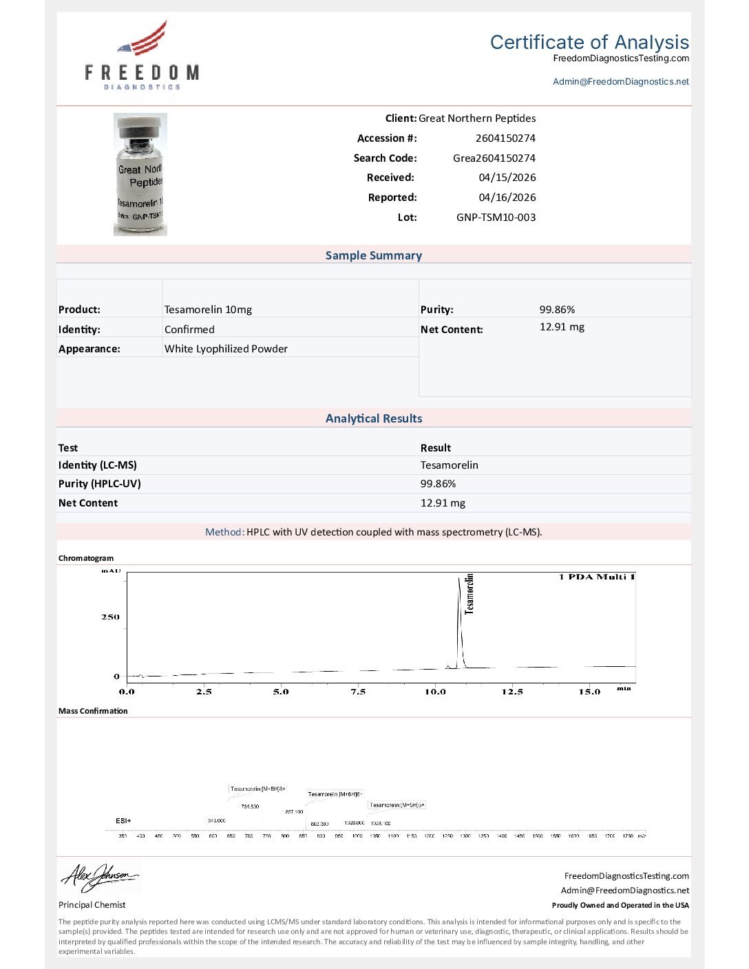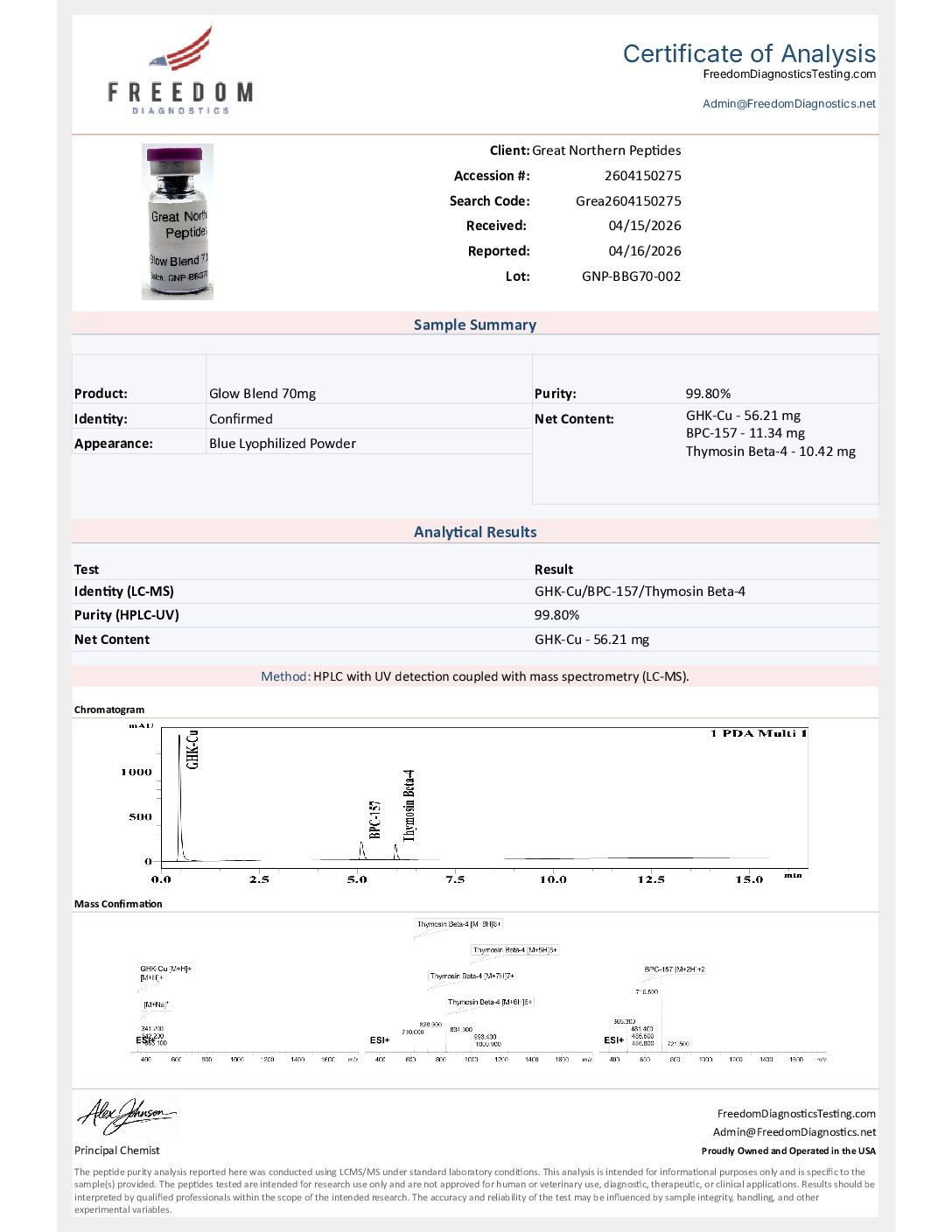 At Great Northern Peptides, quality always comes first. Every product is independently tested to confirm purity, potency, and accurate dosing. We post all Certificates of Analysis (COAs) so you can verify results instantly. Because of this commitment, our customers shop with complete confidence and peace of mind.