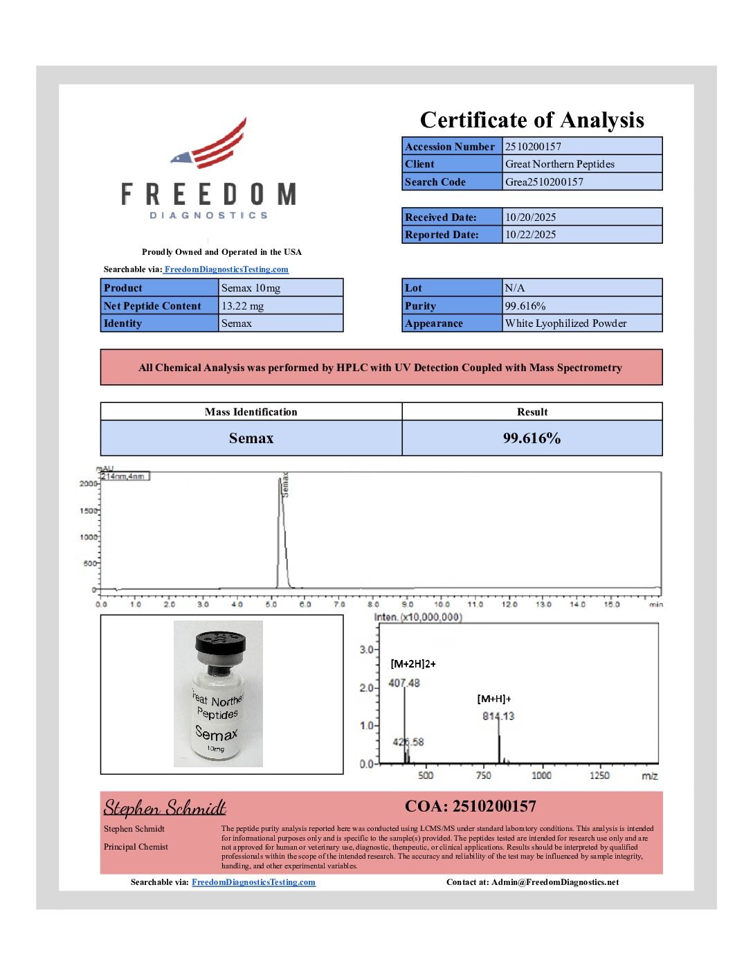Each vial contains: 10 mg Semax (lyophilized powder)
